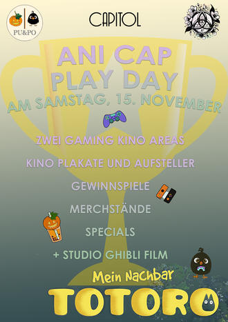 Freut euch auf Gaming Areas, Merchstände, Gewinnspiele, Poster und weitere Specials! Zwischen 10:00 Uhr und 15:00 Uhr steht im CAPITOL alles im Zeichen des Anime! Der Fillm "Mein Nachbar Totoro" läuft im Originalton mit deutschen Untertiteln.